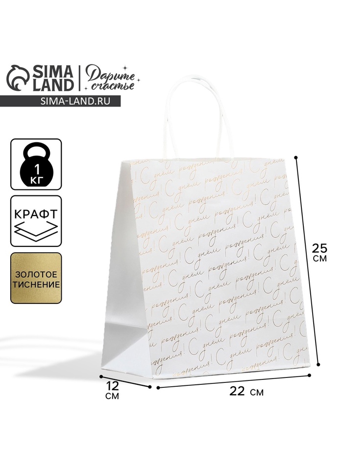Пакет подарочный крафтовый, упаковка, «С днём рождения», 22 х 25 х 12 см купить в интернет-магазине по доступной цене